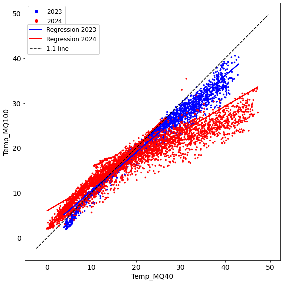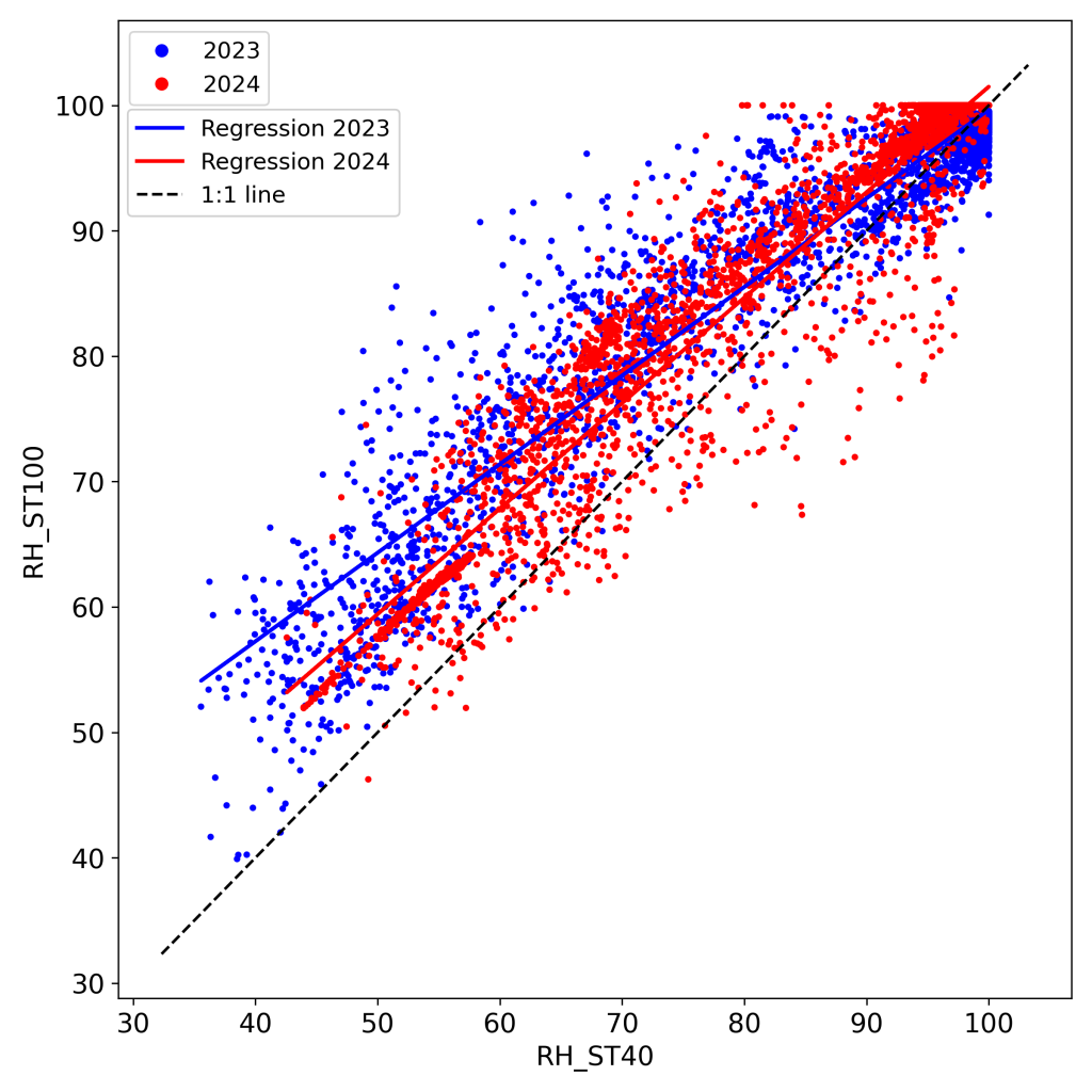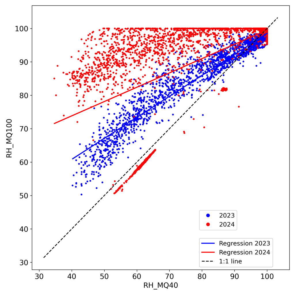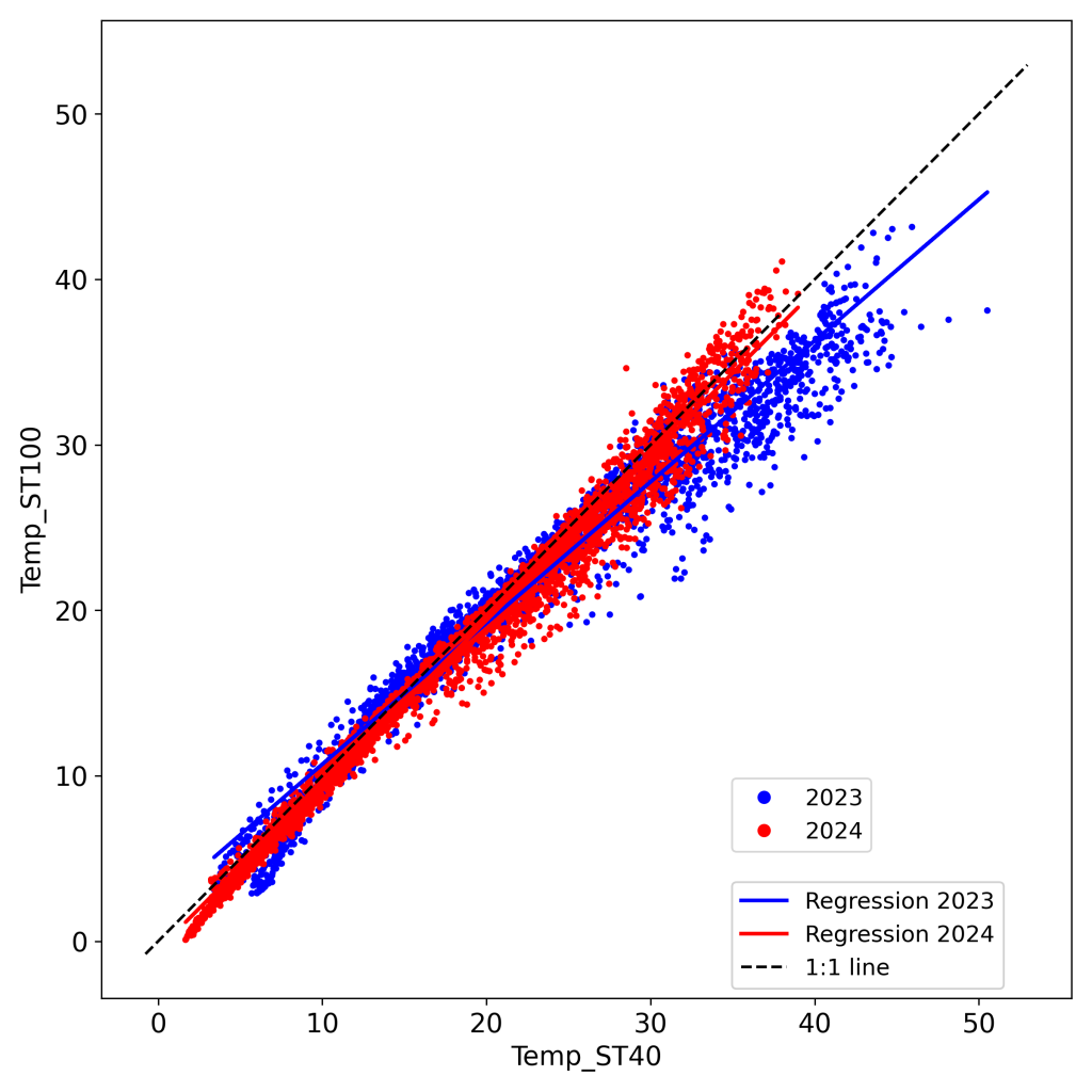 The majority of temperature points lie below the 1:1 line indicating that the 40 lb N/acre tend to be warmer being a more open canopy. Tmq100 was substantially cooler than Tmq40 in 2024 as compared to 2023, as indicated by steeper slope in the case of 2023 (closer to 1:1 line). Furthermore, the relative humidity under 100 lb N/acre tend to be greater than under 40 lb N/acre (Figure 3). Data points depicting RH data also shows that most points occur above the 1:1 line in the figure indicating that a lushy canopy produced by high N fertilizer application is associated with 100 lb N/acre has a tendency of keeping the canopy relatively humid. The conditions of moderately cool temperatures and high relative humidity at a higher N application are ideal for fungal pathogen and hence, higher fruit rot incidences. We have not yet isolated the fungal pathogens present and whether there is a difference in microbial populations and diversities under different fertilizer N regimes. Suffice to say that our data is pointing to a situation where a greater fruit rot incidence occurs under high fertilizer N application.